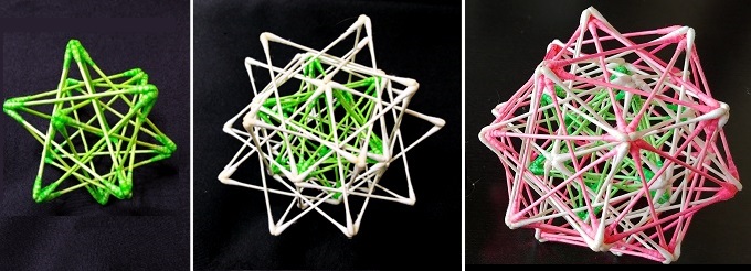 ■2■ベビー綿棒30本を黄金比で交差させてできる「星の種」(小星形12面体)。この12の頂点から綿棒60本を使って1辺1単位の正4面体を20個立ち上げると、その頂点は正12面体の形になる。この頂点間の距離は1/φなので、その12面を綿棒60本を使って5芒星で埋めると「星の籠」(5芒星12面体)ができた。