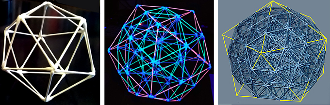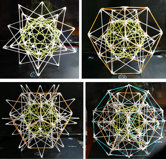 ■7■第2層の正5角形部分に60本加えて正5角錐にすれば2倍体正20面体になり、第3層の正5角形部分に60本加えて正5角錐にすれば3倍体正20面体になる。複雑に見えるこの3重の綿棒多面体も、見方を変えればシンプルに1倍体・2倍体・3倍体の正20面体の3層構造と重なっていることが分かるだろう。