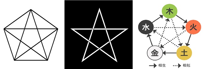 ■8■古代ギリシャのピタゴラス学派の象徴であり、安倍晴明が用いた呪符でもある紋形で、陰陽五行説では万物を陰陽2元と木火土金水の5元素で捉え、5角形と5芒星を用いて説明する。十干十二支の60や黄金比も自然に立ち上がるこの5芒星を、今立体に立ち上げて世界を見る視座も必要ではなかろうか。