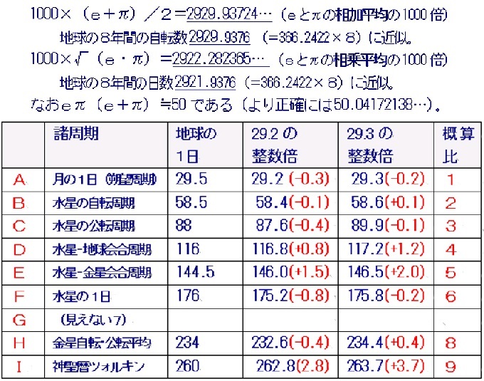 ■超越数のe(ネイピア数)とπ(円周率)の只ならぬ関係の簡単な一つの視座からの捉え方。月の朔望周期を1とした水星・金星のあられもない関係(笑)。