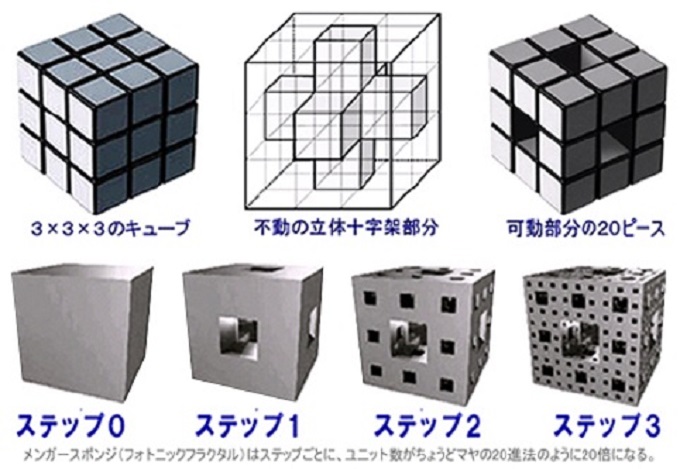 ■3■メンガースポンジは正6面体に一度穴を空ける毎にその体積は7/27ずつ減少するが、逆にマクロ方向に最初の正6面体を単位立方体として同じ形状を積み上げていく操作を考えよう。この3次元的なフラクタル展開の体積比は各フェイズ毎に1:20:400:8000…となって行く。つまり20進法的展開だ。