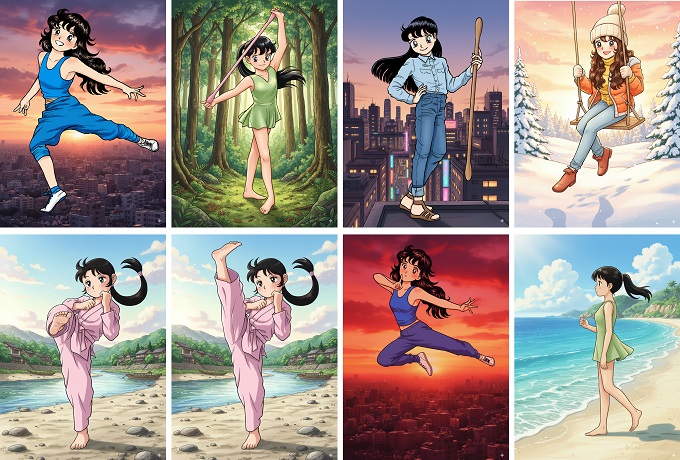 動画とは別に白黒の絵をAIに指示して着色させたものや、それを更に少しポーズを変えてもらった画像たち。