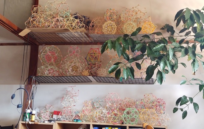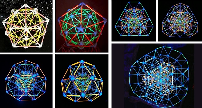 ■1■綿棒多面体の自室内ディスプレイ棚が、夏の終わりの彼岸の前に微妙に乱れてきた。接続部分のボンド溶解や、自重と上に乗る多面体の重みで歪み、接続部分が壊れかけたものがちらほらある。構造理解のための過去の試作品や、同じ構造を複数個制作したものもあるので、すっきり整理することにした。