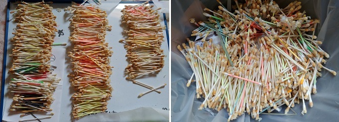 ■5■数を数えて命を吹き込んだ。この場合命とは「形」だ。形は大きさも動きも回転も在るとも無いとも言えない領域から、綿棒という基本単位で「数」を数え対称性を揃えて目に見える物質にした。いっそ上に乗ってぐしゃりと潰そうかとも思ったが、なんとなく敬意を以って1本ずつバラしていくことにした。
