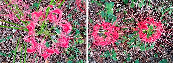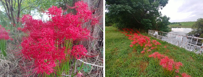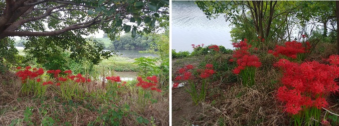 ■5■彼岸花(特に鱗茎)には毒性があり、そこを荒らす動物が避けるように、人間が水田の畦や墓地に植えられたと考えられている。それにしても川に沿ってずっと少しずつ群生している。いくら自力で地下の鱗茎を増殖しても、これだけ広域に渡って生息地を展開するのは不可能だろう。人力でも無理だろう。