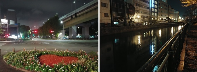 ■5■この辺の堀川沿いの小道はかなり好きだ。途中川の見えない地区を歩いた後、名古屋城のお堀の南西端に着く。実は堀川自体はお堀に直接接してはいない。堀の西北端を迂回してそこから三階橋取水場まで北東進する。日の出の兆しすらまだ見えない暗い空を背景に、堀は異次元との境目のように見える。