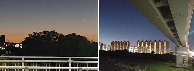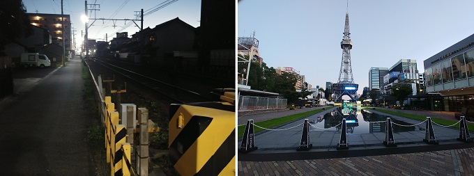 ■5■橋を渡り切ると踏切の音が聞こえた。名鉄瀬戸線だ。先の交差点近くに守山自衛隊前駅がある。このガイドウェイバス高架線が乗っかる道を直進しても、始発は5時50分台なので当分帰路はない。ならばと右折して名鉄の線路横を歩くことにした。昨日とはまた違う線路沿いなのだが、まだ日の出は遠い。