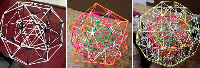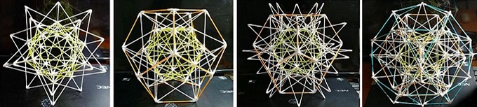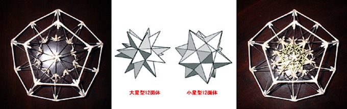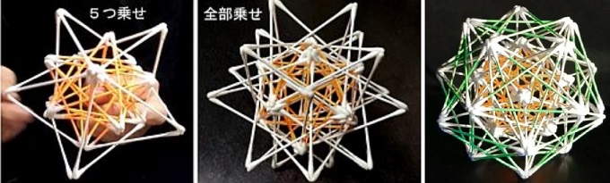 ■3■この綿棒60本からなる大星形12面体だけでも自立はしないので、1辺1の正12面体と支え合っているとも言える。大星形12面体の内部にある空白は、1辺1/φの正20面体でもある。綿棒でこの1辺1/φの正20面体を作ると、その形状は小星形12面体となる。これは綿棒で作るほぼ最小の立体でもある。