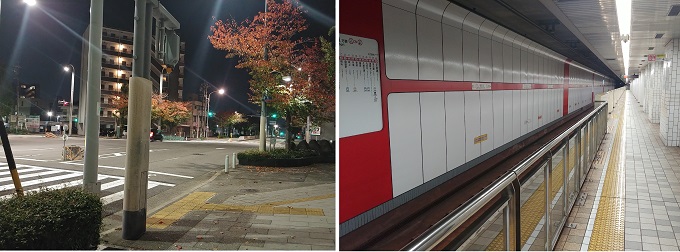 ■5■車内で一休みしてから、10駅目のナゴヤドーム前矢田駅で降りる。御器所を南北に貫く名古屋環状線の南側から、北端にワープした形だ。もうすっかり明るい道を南下開始だ。左手にイオンモールやナゴヤドームを眺めながら、かつての塩の集積所であり、信州や美濃への出荷場所だった出来町まで歩く。