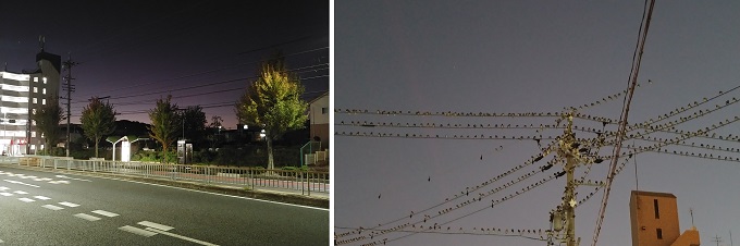 ■7■音聞山をなだらかに下ると、熱田神宮や新瑞橋から続く県道221号に合流する。新島田橋で天白川を越えて県道沿いに歩き続ける。東の空がうっすらと白んでくる。原駅近くの交差点まで来ると、ムクドリの鳴き交わす声が爆音のように聞こえた。ここは以前来た時もそうだった。ムクドリ特異点なのか?