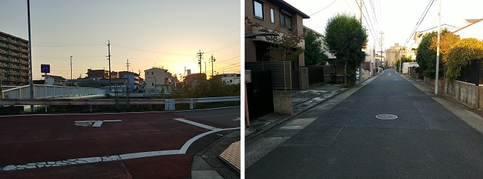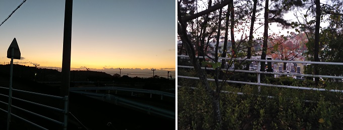 ■5■上り坂の車道横の歩道を進む。両側のシルエットに挟まった行く手の空が明るくなっているので全然怖くはない。少しずつ明るくなって来るに従って、視界に色合が立ち上がってくる。光学的物理や色彩学的認識の知識は少しはあるつもりだが、生命的には内外を超えた自らの内部から世界が蘇ってくる。