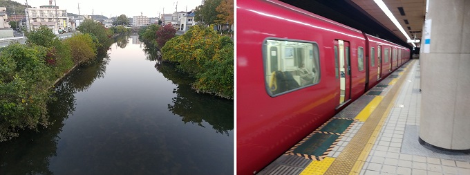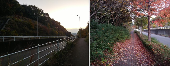 ■7■超早足での暗い夜道の峠越えだったら、このまま真直ぐ国道153号線を突き進み、鶴舞線終点の赤池まで突き進むつもりだったが、今日は朝明りの中でゆっくり景色を楽しむモードになったので、右折して植田川岸を塩釜口駅まで下ることにした。川向こうの公園ではもう、ラジオ体操の準備をしている。