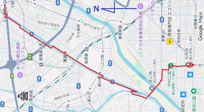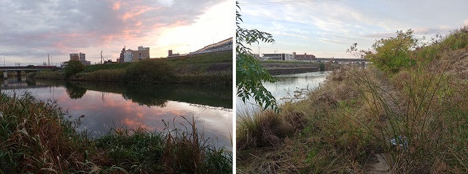 ■1■5時57分の地下鉄鶴舞線犬山行に乗り、6時19分に上小山田で降りる。今日はここから新川沿いを川下に向かう。去年1度歩いた道筋だが、今回は全て対岸を歩くのだ。駅から川岸まで出るのに迷って、ちょうど日の出時間の6時30分に歩行スタート。西岸の整備は橋桁下付近だけでいきなり道が消えた。