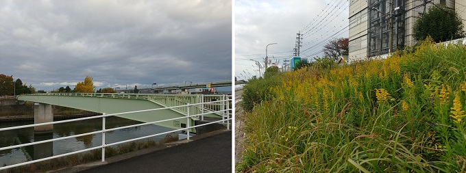 ■4■この辺りから新川の両岸の遊歩道がしっかり整備されていて、一部の中学生や高校生の通学路にもなっているようだ。空が綺麗だ。名鉄本線と新川大橋をくぐり、東海道本線と新幹線を抜けると清須市役所があった。今年は夏が長く秋が短かったからか、背の低いセイタカアワダチソウ群をよく見かける。
