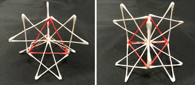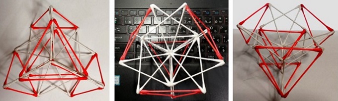 ■3■2次元的な5芒星と3次元的な正4面体の複合立体だが、正確にはそれぞれ正4面体内部に陥入した5芒星の頂点群は、正4面体の重心からわずかにオーバーフロウしてしまうのだが、綿棒の頂点部分でそれらを吸収・調整してその形を維持することが可能だ。したがって5芒星もわずかだが歪んでいる。