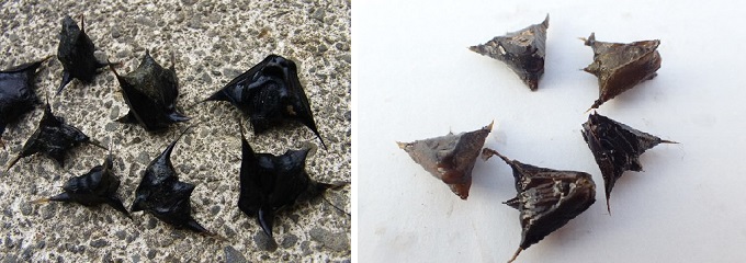 ■5■ヒシはミソハギ科ヒシ属の一年草で水面に浮く浮葉植物だ。池沼に生え、種子は食用になる。名前は多面体でいう菱形の「菱」の字だが、個人的にはこの種子はむしろ昔の漫画で見たマキビシのイメージが強い。形が正4面体構造なので常にトゲが上を向くので、忍者が追手から逃れるために撒いたあれだ。