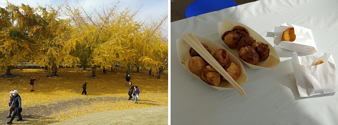 ■5■町に万遍なく銀杏が植わっているのかも知れないが、特に東北端の名鉄山崎駅とその近くにあるぎんなんパークと祐専寺の古木が有名とある。昼前に沢山ある無料駐車場の1つに着いたのだが、ぎんなんパークは普通の祭りのように出店があった。ここだけにしかない銀杏コロッケと銀杏たこ焼きを食す。