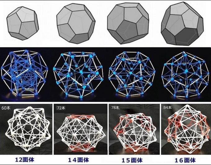 ■3■次にこのモデルを5芒星と6芒星で作ってみよう。全体の位置関係が分かりやすいように、6芒星を赤く着色してる。12面体はそのまま正12面体だが、6芒星の中心を繋ぐと14面体は線に、15面体は正3角形に、16面体は正4面体になることが分かる。それぞれみな12個の5芒星の接続形は異なっている。