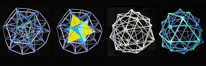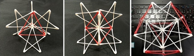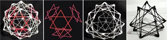 ■6■これら「四籠女」「十二夜」「十六夜」と仮称された綿棒多面体と、先日作ってみた5芒星6つの頂点を重心に集めてできる「星の巣」は、基本的に全て直交3軸でなく正4面体構造の4軸を基本として重ね、合体することも可能だ。次回はこれらを1つ1つもう少し丁寧に見ていく予定だ。3と4で5に至ろう。