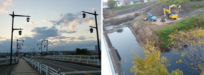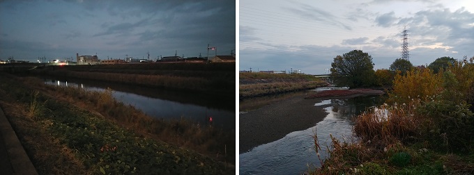 ■1■7℃、体感6℃。5時35分、鶴舞線始発に乗り、6時、上小田井で降りる。今日はここから新川を遡るのだ。…て、スタート地点は真っ暗かよ。そして川風が冷たい。ひたすら両手を振って歩かねば。堤防の上も川べりも遊歩道は整備されている。頭がつかえそうな橋桁の下で、誰かが膝を抱えていて驚いた。