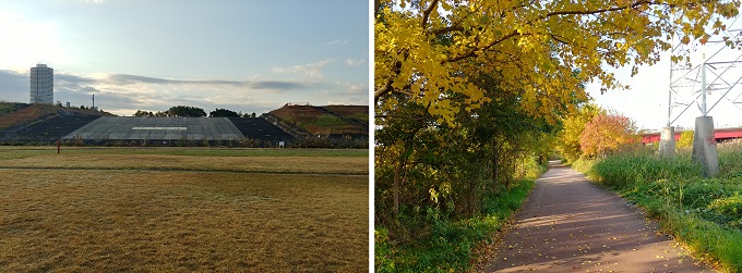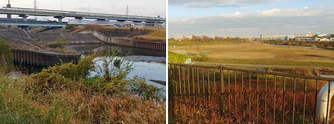 ■7■名古屋環状線2号、国道302号、城北線を一気にくぐると、そこから庄内川洗堰までの間に、1kmほど公園や緑地やグラウンド等が広がっている。庄内川の堤が削り取られた洗堰まで行ってみると、増水時に庄内川の水がこの堰を越えてここに流れ込み、そのまま新川までの流水路になるのだと見て取れる。