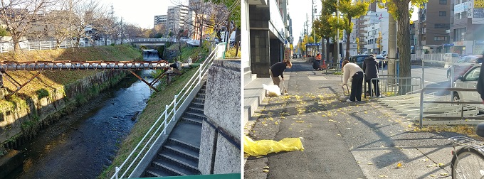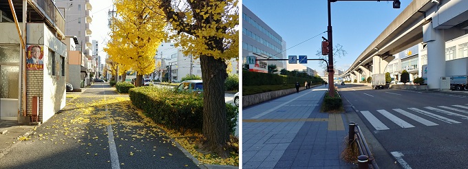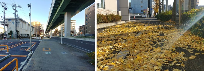 ■1■午前8時、7℃、体感4℃。今日は風が強い。御器所から鶴舞線に乗り浄心で下車。そのまま500mほど北上すると秩父通に出る。そこで右折して直交する名古屋市道環状線に沿い歩き続ける。銀杏並木の落葉が歩道を黄に染めて吹き溜っている。今日は歩く道筋でそれを掃き集める人たちをあちこちで見た。
