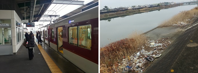 ■1■今日は中川区の庄内川と新川に挟まれた河口近くの地を歩く。名古屋まで出てから近鉄名古屋線で伏屋まで行く。関西まで繋がっているのでアベノハルカスの広告などがあって面白い。驚いたことに1車両に優先席が11席もあった。伏屋から新川東岸に出てそこから南下を開始。河川敷はなく車道を歩く。