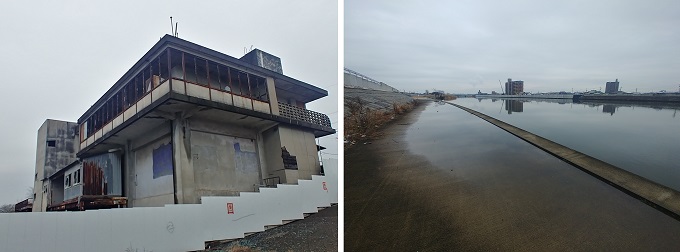 ■3■突然目の前に下之一色漁港跡が現れた。伊勢湾台風の後の高潮防波堤建設で漁場がなくなるまで稼働していた港と施設だった。ガラスは割れ、天井は抜けている。人が入らないよう板で作られた塀に囲まれていた。記念という名目で以前から放置されたままだ。何かに再利用できそうなのにもったいない。