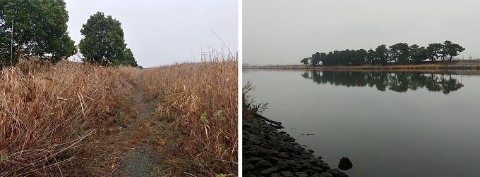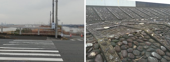 ■5■2つの川同士の間はわずか60mほどまで近づくが、結局合流しないまま5kmほど先まで併流するのだ。ここで庄内川西岸に道筋を変えて北上を開始する。庄内川の方には少し広い河川敷があり、道幅が3mほどの石畳の遊歩道があった。大石をびっしりはめ込んだ堤防の道はやがて枯れ葦の一本道になる。