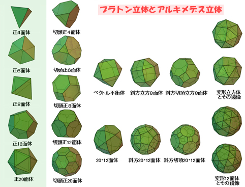 ■7■他のプラトン立体とアルキメデス立体は2重に限らず3重・4重・5重の回転対称性でも稜線の両側は同じ形なのだ。だから表面だけでも対称性を見て取れる。私たちは面のある立体の前面は見えるが裏側は見えない。だがスケルトンの綿棒多面体は反対側が見えるし、射影すればその対称性も見て取れる。