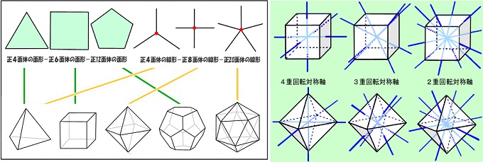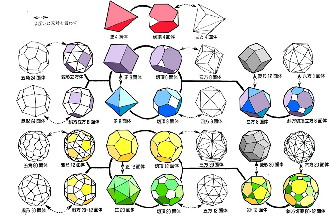 ■7■この2立体の2重回転対称の矛盾を解消するために、数学者達は視座の抽象化を断行した。面に接する多角形の種類を無視して、面の境界の構造のみを対称性の対象とし、立体が空間を占有する容積の形が回転で一致すればそれを対称軸と認める。この抽象化により2立体も同じ回転群に統合されたのだ。