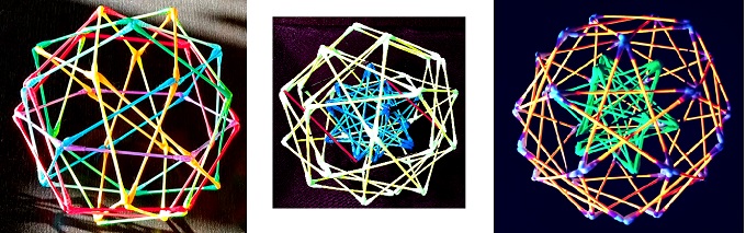 ■3■全ての回転対称軸は、対になる2端点の中心で立体の重心を貫いている。そして残る2重回転対称性は、それぞれの線の線心と裏側の線心を貫いた軸の周りに見て取れる。線を挟む多角形はそれぞれ同じ正3角形・正方形・正5角形をしている。これらの回転対称性は多面体の表面だけを見て理解できた。