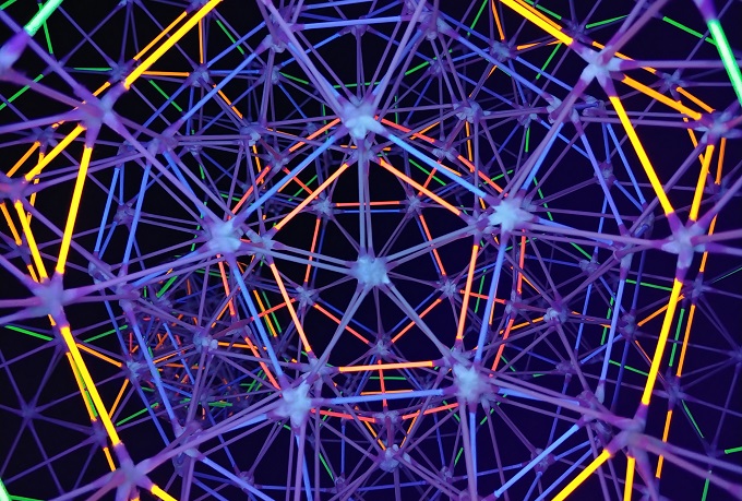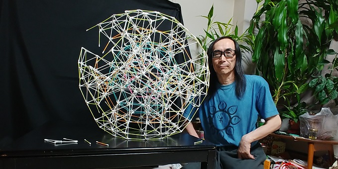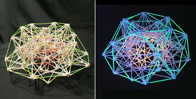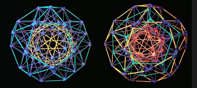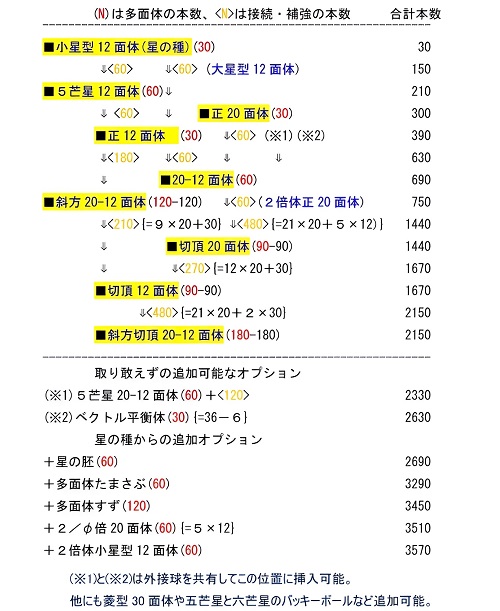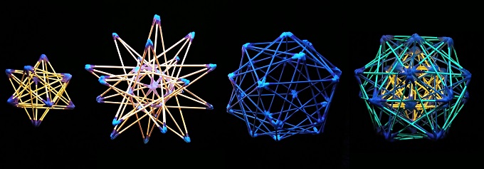 ■1■「綿棒多面体の全部乗せ」についてもう少し考えてみよう。1辺1本で最小の小星型12面体から最大の斜方切頂20-12面体までを、5重回転対称性に合わせて多重多層に重ね作ったわけだが、正12面体と正20面体の他に正8面体と正4面体も見えた。そして正6面体も5芒星12面体の中に5重に入っていた。