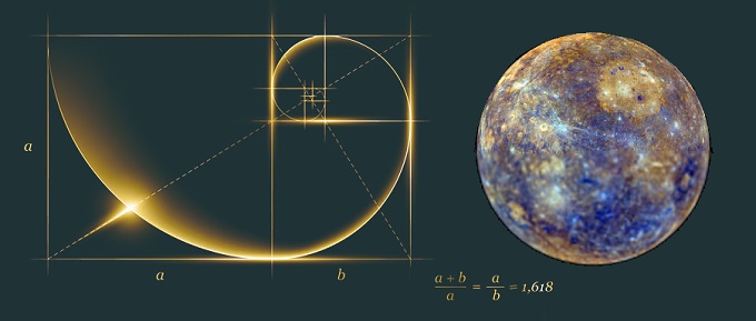 ■1■金星と地球の間には黄金比的な関係が幾つもあるが、水星と地球の間にも黄金比がらみの関係を見て取ることができる。例えば水星−太陽間の距離と地球−太陽間の距離は58344000qと149600000qだが、天文単位で表せば0.387:1となる。この水星の値は黄金比の逆数2乗(=0.381982059…)に非常に近い。