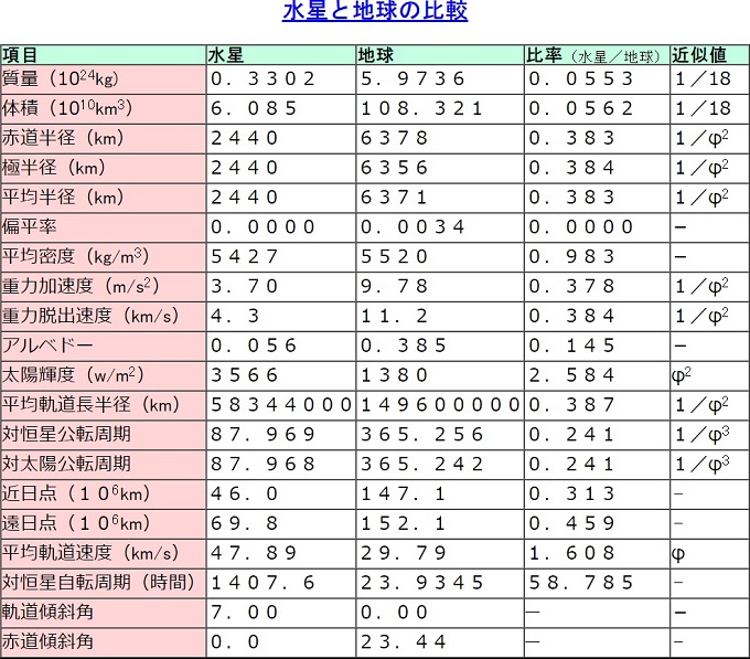 ■5■それから太陽輝度は水星の3566W/s2に対して地球は1380W/s2で、この比は0.387:1でほぼ1:φ2となっている。また水星の公転周期87.968日と地球の公転周期365.2422日の比は0.241:1で、ほぼ1/φ3:1になっている。このように水星と地球は黄金比の関係を沢山内包しているのだがなぜなのだろう (※)太陽輝度…惑星表面に降り注ぐ太陽エネルギー量。