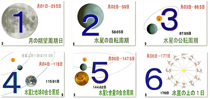 「月面上の1日」となる。この29.5日を基本単位の1として水星の諸周期を見ると、綺麗に整数倍になっているのが分かる。水星の自転周期が2、公転周期は3、地球との会合周期が4、金星との会合周期は5、水星上の1日は6になる。