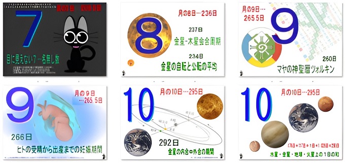 ■3■音楽理論では7(セブンス)と11(イレブンス)が不協和音を生む要素として知られているが、この7倍と11倍にも安定した周期は見たらない。しかし金星の自転周期243日と公転の225日の平均234日が8に、マヤの神聖暦260日やヒトの妊娠期間266日が9に、金星の外合⇔内合の期間が10に対応すると言える。