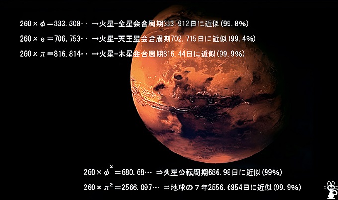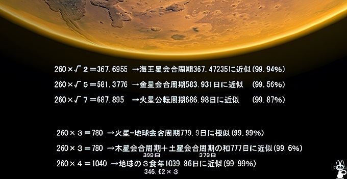 ■5■260日に自然対数の底eを掛けた値706.753…は、火星と天王星の会合周期702.715日に近似している。また260×√2=367.6955は、海王星の会合周期367.47235に近似している。さらに260×√5=581.3776は、金星の会合周期の583.931日に近似し、260×√7=687.895は、火星公転周期687日に極似する。