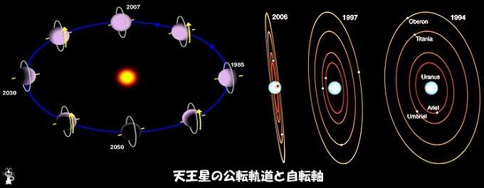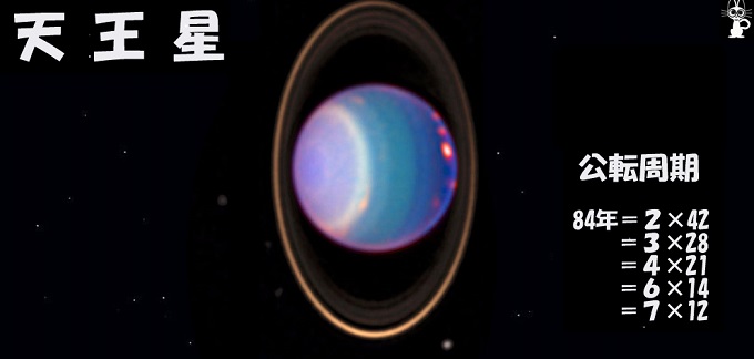 ■7■この今の日本人の平均寿命にも近い天王星の公転周期の長さに対し、自転周期は地球の1日より短い。最新の観測から正確な自転周期は17時間14分52秒だということが分かっている。地球の1自転に対して天王星の1自転は地球の0.7185に相当する。この値は365:260=1:0.7123に非常に近い(99.1%)。
