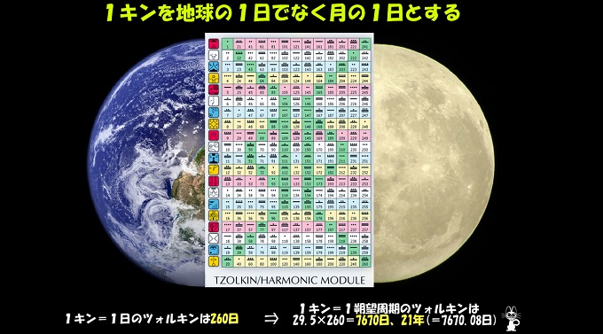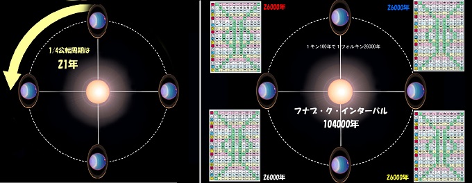 ■5■そこで上述したように天王星の公転周期の82.022地球年を、1キンを1朔望周期(つまり月面上の1日)として計算すると4ツォルキンになる。あるいは1キンを4朔望周期の118日として捉えると、それはぴったり1ツォルキンになる。この4つをまとめて1つと見る周期に「フナプ・ク・インターバル」がある。