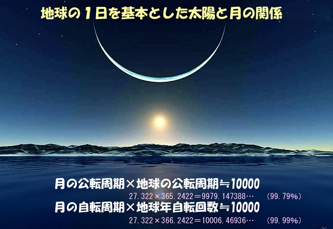 ■1■恒星の太陽・惑星の地球・衛星の月は暦の3大要素であり、それらの関係の中で「地球の1日」を基本の1として先ずは話を始めよう。月の公転周期と地球の公転周期の積を考えると、10000日に近似する。また月の自転周期と地球の1年間の自転回数の積もまた、10000日に近似する。これはどういうことか?