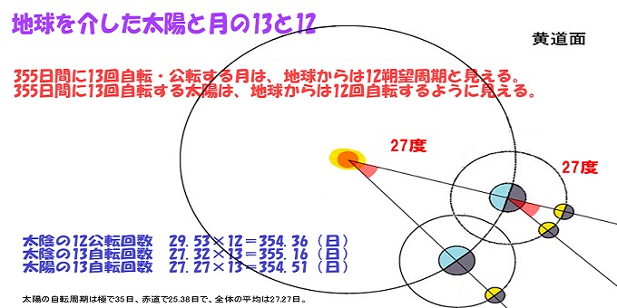■2■月は潮汐ロックにより自転と公転が同じになり、地球の1年間の日数+1が自転数になるので、2つの値が近似するのは自明だ。しかし互いの周回数を交換するように、月が365公転することと、地球が27.32公転することが、切りの良い10000日の表裏として現れる事実は、偶然として済ますには美しすぎる。