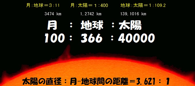 ■5■地球の1年の日数の逆数の0.002737909263…日は換算すると3分56秒となるが、これはほぼぴったり恒星日と太陽日の差に等しい。また月の1公転・自転周期の逆数の0.36600541…日は換算すると52分となるが、こちらはほぼ太陽日と太陰日(月が子午線を2度通過するのに要する時間)との差に等しい。 1/365.24219日=0.0027379日=3分56秒…恒星日と太陽日の差に等しい ■6■次にこの月・地球・太陽の絶妙な3つ組関係を、周期でなく空間的な大きさで見てみよう。それぞれの直径は太陽が約139,2000km、地球は約1,2742km、月は約3,475kmだから、月:地球=3:11、月:太陽=1:400、地球:太陽=1:109.2、そして月:地球:太陽=100:366:40000 という関係が見て取れる。