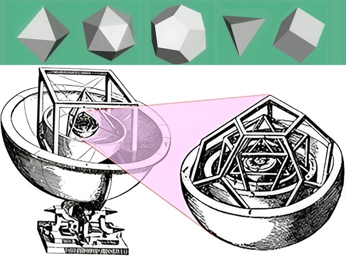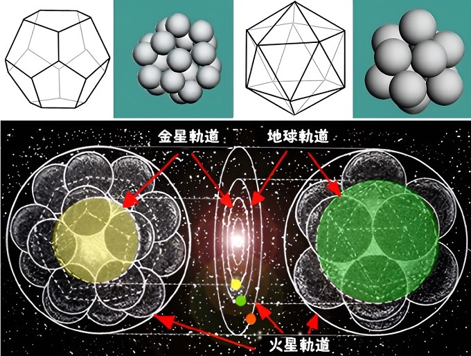 ■1■上図は惑星軌道殻に間にプラトン立体をはめ込んだ、ケプラーの太陽系モデルだ。これだと金星と地球の軌道殻の間に正20面体が入り、地球と火星の軌道殻の間に正12面体が入っている。殻で厚みを調整したりしているので現在は破棄されているが、実は正12面体と正20面体を逆にすればうまく整合する。