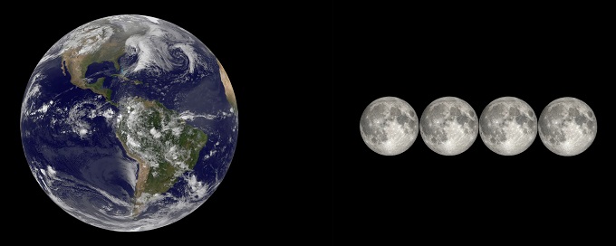 ■3■ここで太陽系諸周期を表現する時、地球の1年や1日だけでなく月の朔望周期29.5日(=月の1)を基本単位として用いても機能することを思いだし、月を周期だけでなく長さや距離の単位としても使えるのではと思いついた。月の赤道直径は約3,476km、極直径は約3,472kmなので、平均は約3,474kmになる。