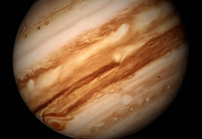 ■1■木星は太陽系最大の惑星で、太陽系惑星の全質量の2/3を占めている。その直径は地球の約11倍、重さは318倍、体積は1321倍だ。主成分は水素とヘリウム。高速自転しているため、遠心力で赤道方向に膨らんでいる。表面には地球1個分の大赤斑が反時計回りに渦を巻きつつ、約6日で1回転している。