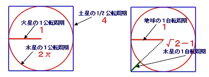 ■3■上図左は火星と木星の公転周期の比を円の半径と円周で示したものだ。火星の公転周期687日を半径とした円を描けば、円周は687×2π=4316.5483となり、木星の公転周期に近似するということを表現している(99.6%)。結局これは63火星公転周期が10木星公転周期にほぼ等しいということの別の表現だ。