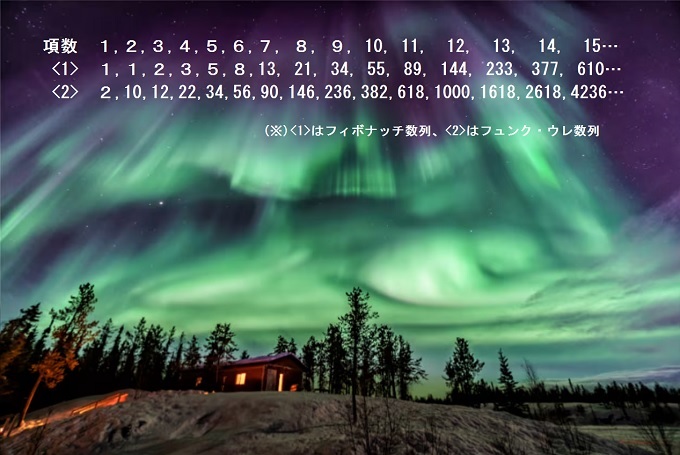 ■1■「フュンク・ウレの数列」は<初項2、第2項10>で、それ以降はフィボナッチ数列と同様に前2項の和で項が進んでいく数列だ。この項数を辿っていくと第11項で618、第12項で1000、第13項で1618、第14項で2618となっていることに気づく。黄金比の1/φ、1、φ、φ2の1000倍の整数という画期的な数の並びだ。