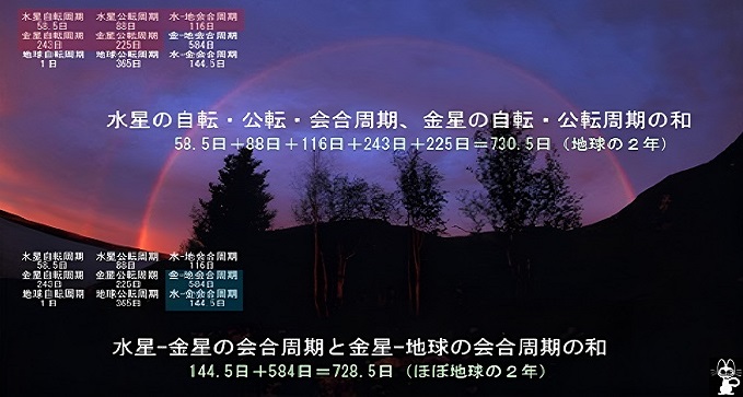 ■4■水星の自転周期・公転周期・会合周期及び、金星の自転周期・公転周期の和は(58.65+87.97+115.88+243.02+224.70=)730.22日で、地球の2年(365.25×2=)730.50日に近似する(99.96%)。また水星-金星及び金星-地球の会合周期の和も(144.57+583.92=)728.49日で地球の2年に近似する(99.72%)。