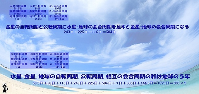 ■5■水星の会合周期、金星の会合周期、火星の会合周期の和は、(115.88+583.92+779.94=)1479.74で地球の4年1461日に近似する(98.73%)。また水星・金星・地球3星の自転周期と公転周期、そしてそれぞれ2星間の会合周期の総和は1825日で、地球の1年365.25日の5年分1926.25に近似する(99.93%)。